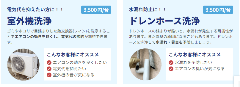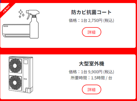 | オプション | 室外機洗浄 3,500円/台 防カビ・抗菌コート 2,500円/台 ドレンホース洗浄 3,500円/台 (セット割引あり) |