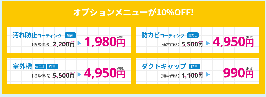 | オプション | 汚れ防止コーティング 1,980円 防カビコーティング 4,950円 室外機 4,950円 ダクトキャップ 990円 |
