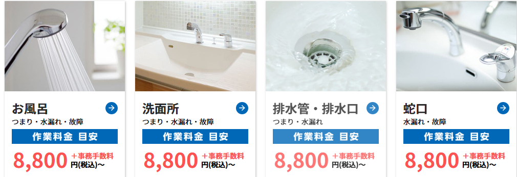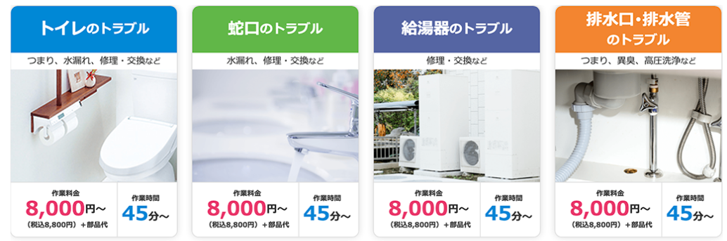緊急性が高いトラブル ・水漏れ ・蛇口・止水栓の水漏れ ・排水の逆流や緊急性の低いウォシュレット交換 ・トイレや洗面台本体の交換 ・水回りリフォーム ・排水管高圧洗浄まで対応しています。